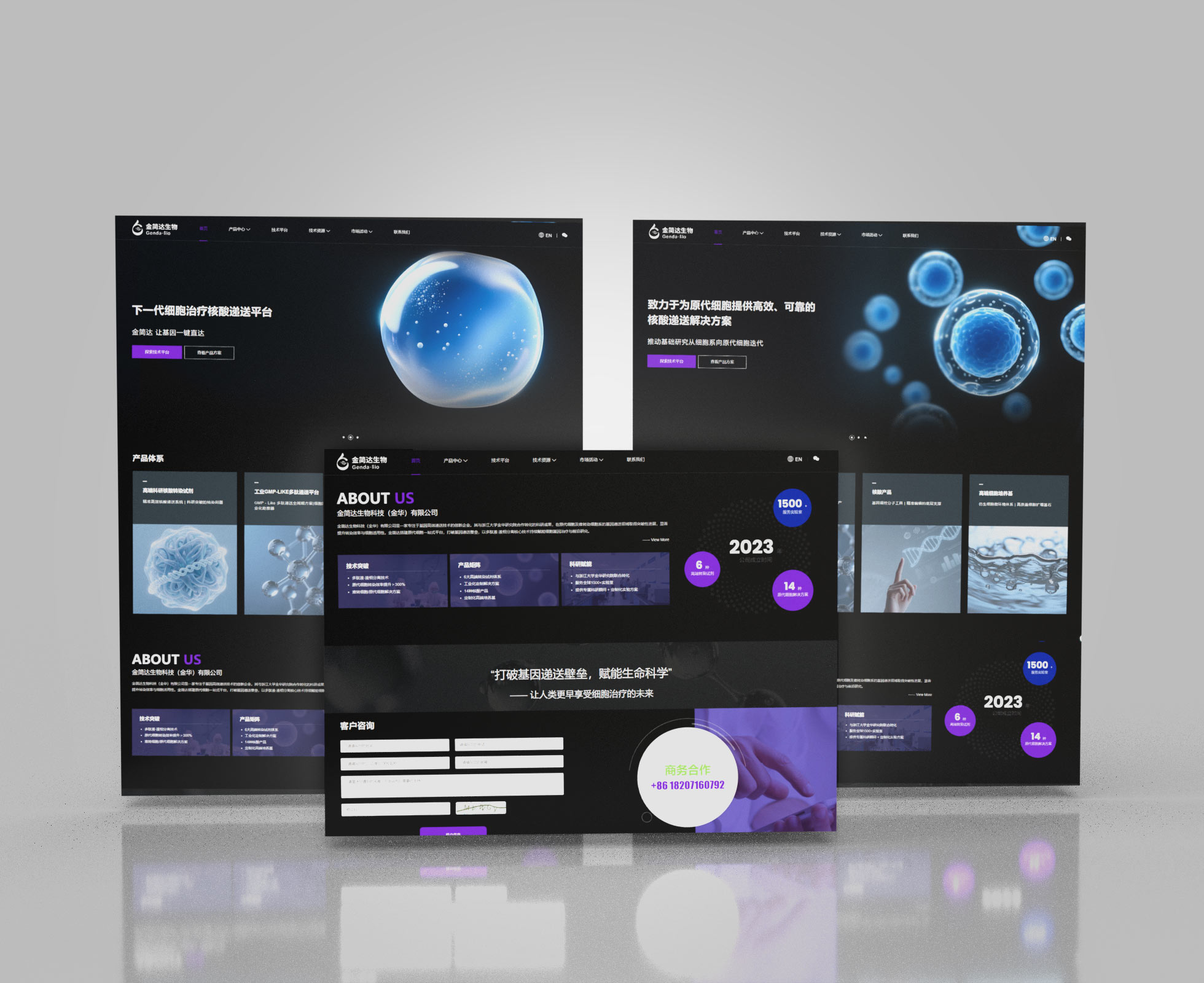 專業(yè)大氣的視覺體系:網(wǎng)站主視覺采用科技藍與生命綠相結(jié)合的配色方案,象征著金簡達生物在嚴(yán)謹(jǐn)科技中對生命科學(xué)的探索。整體布局簡潔大氣,輔以專業(yè)的圖表與高質(zhì)量影像,精準(zhǔn)傳遞出企業(yè)的科技感與專業(yè)度。